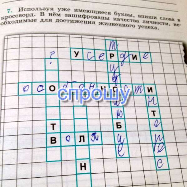 Используя уже имеющееся буквы, впиши слова в кроссворд. В нём зашифрованы качества личности, необходимые для достижения жизненного успеха.