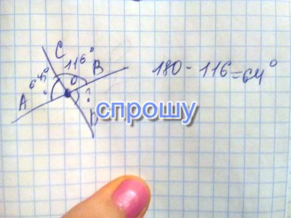 Прямые AB и CD в точке О, причем угол СОВ = 116°.Вычислите градусную меру угла , сторонами которого является луч OD и биссектрисса AOC