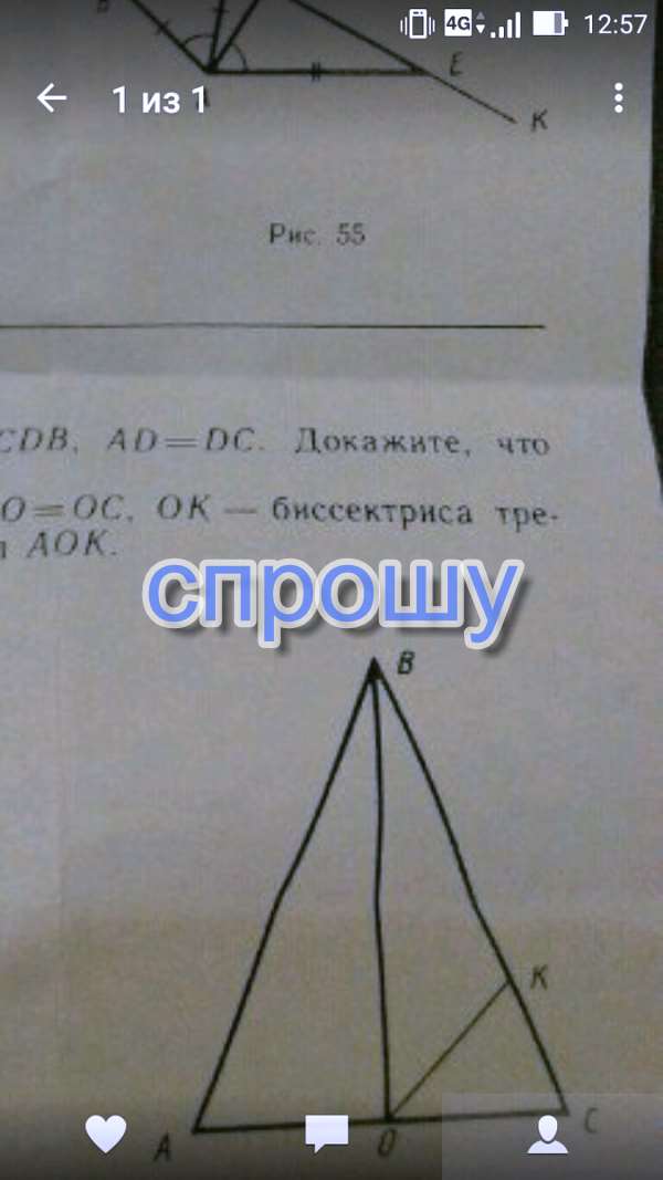 На рисунке 57 AB = BC и AO = OC, OK-биссектриса треугольника boc.Найдите угол AOK