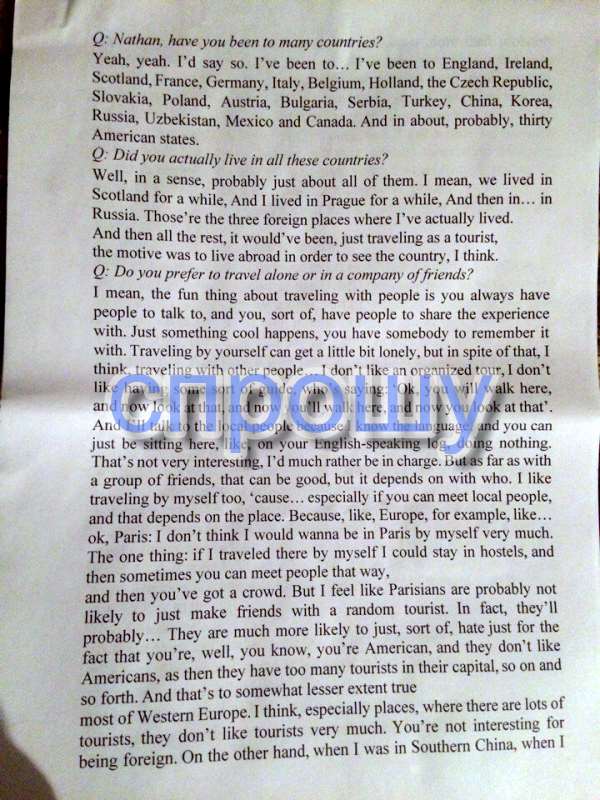 О. Натан, ты была во многих странах Да, да. Я бы сказал так. Я был ... Я был в Англии, Ирландии, Шотландии, Франции, Германии, Италии, Бельгии, Голландии, Чехии, Словакии, Польши, Австрии, Болгарии, Сербии, Турции, Китая, Кореи, России , Узбекистан, Мексика и Канада. А о том, наверное, тридцать американских штатов О. Возможно, вы на самом деле живут во всех этих странах Ну, в некотором смысле, наверное, почти все из них. Я имею в виду, мы жили в Шотландии на некоторое время, и я жил в Праге на некоторое время, а потом в ... в России. Thosere трех иностранных мест, где я на самом деле жили А потом все остальное, это было бы просто путешествовать в качестве туриста мотив должен был жить за границей, чтобы увидеть страну, я думаю. O: Вы предпочитаете путешествовать в одиночку или в компании Frier имею в виду, забавная вещь о путешествии с людьми, у вас всегда есть люди, чтобы говорить, и вы, вроде, есть люди, чтобы поделиться опытом с. Просто что-то круто происходит, у вас есть кто-то, чтобы вспомнить его. Путешествуя самостоятельно может получить немного одиноко, но, несмотря на это, я думаю, что, путешествуя с другими людьми ... Я не люблю организованный тур, я не люблю, своего рода гидом, кто говорит: Хорошо, вы будете ходить здесь и сейчас смотрю на это, и теперь вы будете ходить здесь, а теперь ты смотришь на это, и я буду говорить с местными жителями, потому что я знаю язык, и вы можете просто сидеть здесь, как , на своем английском языке журнал, ничего не делая. Это не очень интересно, я бы предпочел быть ответственным. Но, насколько с группой друзей, что может быть хорошим, но это зависит от того, с кем. Я люблю путешествовать по себе тоже, потому что, особенно если вы можете познакомиться с местными жителями и что зависит от места. Потому что, как Европа, например, как ... хорошо, Париж: Я не думаю, что я бы хочу быть в Париже сам очень много. Одно: если бы я ездил туда сам я мог бы остаться в общежитиях, а затем иногда вы можете встретить людей таким образом, и тогда у вас есть толпа. Но я чувствую, как парижане, вероятно, вряд ли просто подружиться со случайным туриста. Дело в том, что они, вероятно ... Они гораздо более вероятно, просто, вроде, ненавижу просто за то, что ты, ну, вы знаете, что вы американец, и они не любят американцев, а затем они имеют слишком много туристов в их столице, так далее и так далее. И это в несколько меньшей степени, правда, большая часть Западной Европы. Я думаю, что, особенно там, где Есть много туристов, они не любят туристов очень много. Вы не интересны быть иностранным. С другой стороны, когда я был в Южном Китае, когда я