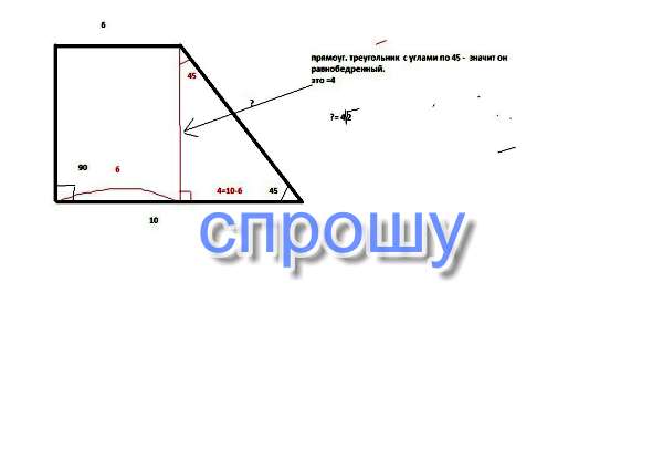 Дано: АВСD - трапеция, АD = 10см, ВС = 6см, угол D = 45 градусов, угол А = 90 градусов.