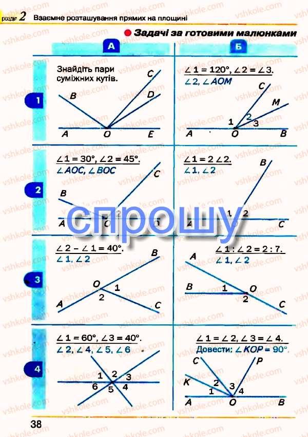 1.2. Общий угол=180 градусам, а нам известно, что больший из них - 120. Значит остальные два, которые равны - 60 градусов. Раз они равны, то каждый маленький угол - 30 градусов. Складываем 120 и 30.