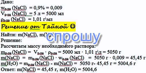 В медицине используется физиологический раствор это 0.9% раствор NaCl в воде.рассчитайте сколько граммов соли и воды нужно для приготовления 5 литров физиологического раствора плотность раствора 1 г/моль