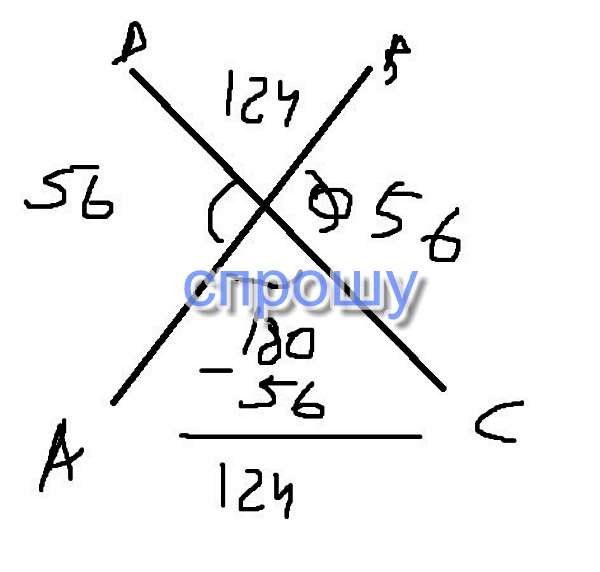 Угол СОВ БУДЕТ 56 градусов так как угол АОД вертикальный. Сумма смежных углов = 180 градусов.Узнаем сколько градусов будет угол ВОД 180-56=124 градуса.