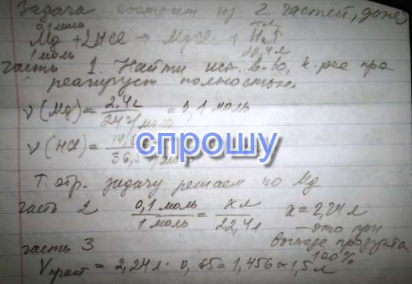2,4г магния растворили в соляной кислоте, содержащей 14,6г хлороводорода. Какой объём газа при этом выделился, если выход 65% (н.у.)?
