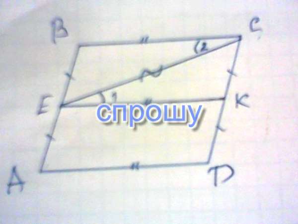 АВСD - данный параллелограмм, АЕ=ВЕ. Проведем КЕ║АD, тогда СК=КD.