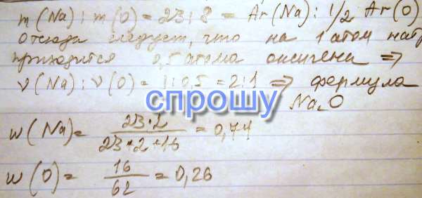 №1 До складу речовини входять атоми Натрію і Оксигену у масовому відношенні 23 : 8. Визначити формулу речовини. Знайти масові частки елементів у сполуках.