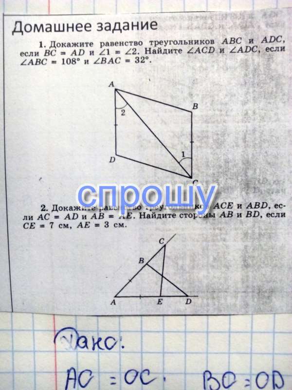 Треугольник равен по 2 углам и стороне между ними,ACB=180-108+32=40,ADC=108,т.к треугольники равные.