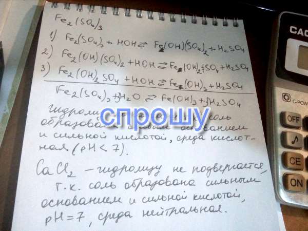 Напишите молекулярные и краткие ионные уравнения реакций гидролиза солей, укажите значения pH растворов солей Fe2(SO4)3, CaCl2