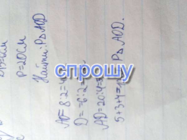 Диагонали ромба АBCD равны 6см и 8 см, а его периметр равен 20см. Найдите периметр треугольника AOD, где О- точка пересечения диагоналей.