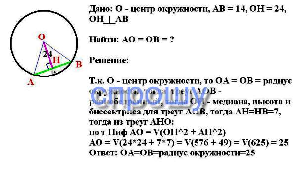 Расстояние от центра окружности до хорды длиной 14 равно 24. найдите радиус окружности