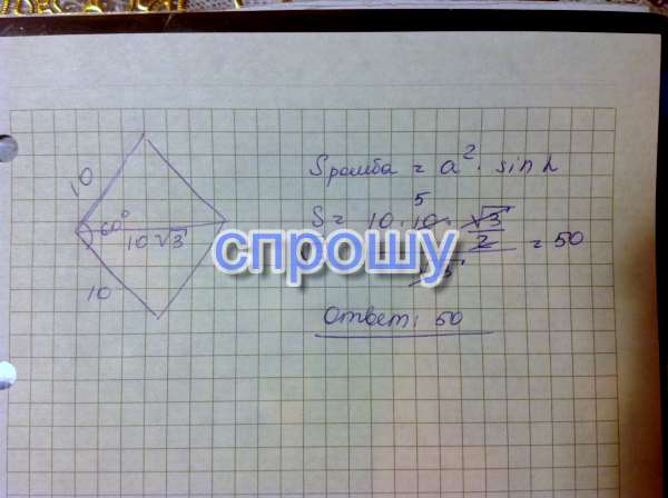 СРОЧНО!!! ПОЖАЛУЙСТА!!!В ромбе сторона равна 10, одна из диагоналей 10 корней из 3, а угол, из которого выходит эта диагональ, равен 60 градусов.Найдите площадь ромба деленную на корень из 3
