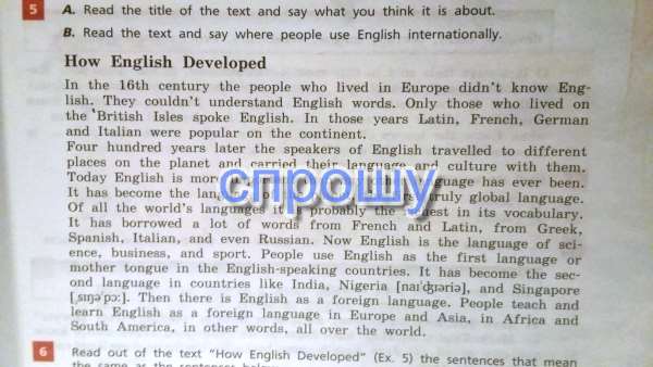 В 16 веке люди, которые жили в Европе не знали английского. Они не понимали английские слова. Только те, кто жил на Британских островах разговаривали на английском. В те года латинский, французский, немецкий и итальянский были популярны на континенте.Четыреста лет спустя англоговорящие стали путешествовать в разные места планеты и распостранять их язык и культуру. На сегодняшний день английский один из важнейших языков когда либо. Он стал языком планеты, первым по-настоящему глобальным языком. Из всех языков мира, он, наверное самый богатый в лексиконе. Он перенял множество слов из французского, латыни, греческого, испанского, итальянского и даже русского языков. Сейчас английский - это язык науки, бизнеса и спорта. Люди используют английский в качестве первого или родного языка в англоязычных странах. Он стал вторым языком в таких странах как Индия, Нигерия и Сингапур. Также английский язык используют как иностранный. Люди обучают и учат английский как иностранный язык в Европе и Азии, в Африке и Южной Америке, иначе говоря, во всем мире.