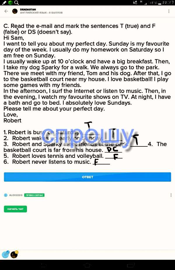 С. Read the e-mail and mark the sentences T (true) and F (false) or DS (doesn’t say).