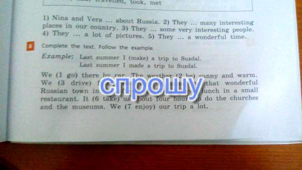 We WENT there by car. The WEATHER was sunny and warm. We DROVE fairly fast and CAME to that wonderful Russian town in the afternoon. We HAD lunch in a small restaurant. It TOOK is about four hours to do the churches and the museums. We ENJOYED our trip a lot.