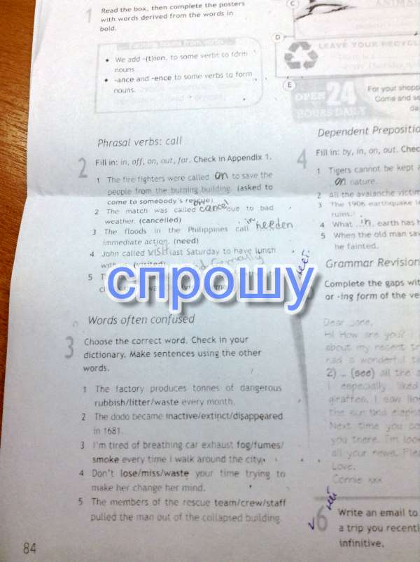 2 задание) 1. Out 2. Off 3. For 4. On 5. In задание 3) 1. Waste, предложения с остальными словами: We throw away rubbish every day. Some people dont respect the nature and throw litter on the ground 2. Extinct, предложения: This theme park has remained inactive for the last 20 years. I havent seen him in a long time, one day he just disappeared. 3. Вообще и fumes and smoke может быть, но я бы лично выбрала первое, предложения: Can you see all that smoke coming out of the factory There was so much fog in the morning 4. Waste, предложения: I always lose my appetite when people talk about nasty things at the dining table. I dont tend to miss good opportunities 5. Team, предложения: Usually, there are at least four crew members on the plane. The staff in this supermarket is very professional and provides great customer service.