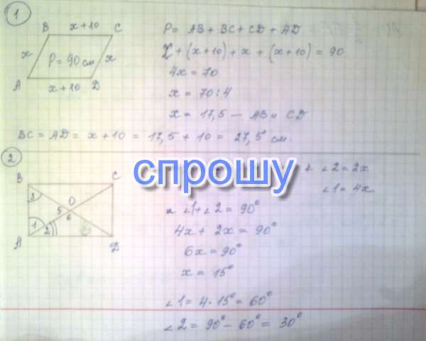 Помогите,пожалуйста!Я бы дал больше балов но больше нету!1)Периметр параллелограмма 90 см.Одна из сторон на 10 см больше другой.Найдите стороны параллелограмма.