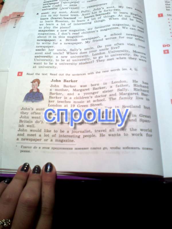 Джон Бэйкер родился в Лондоне. У него есть мама - Маргарет Бэйкер, папа- Ричард Бэйкер и младшая сестра - Салли. Ричард Б. - детский доктор, а Маргарет Б. - учитель музыки в школе. Семья живет в Лондоне на улице Грин стрит (зелёная улица), 19. Тетя, дядя и кузина Джона живут в Шотландии, но часто приезжают в Лондон, чтобы навестить Бэйкеров. Джон Б. пошел в школу в 5 лет (как и все дети в Англии). Джон хочет разговаривать на французком, русском и испанском хорошо. Джон хотел бы быть журналистом, путешествовать по всему миру и встречаться с интересными людьми. Он хочет писать для газет или журналов.