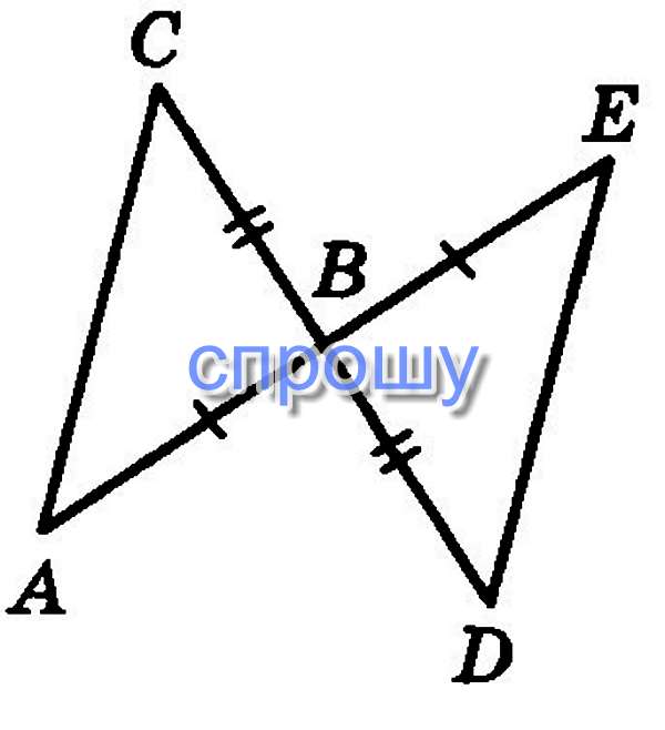 угол DBE= углу CBA, т. к. смежные. AB=BE; DB=BC. следовательно треугольник DBE равен треугольнику ABC. Из равенства треугольников следует равенство углов. Угол D равен углу C, а угол E равен углу A.
