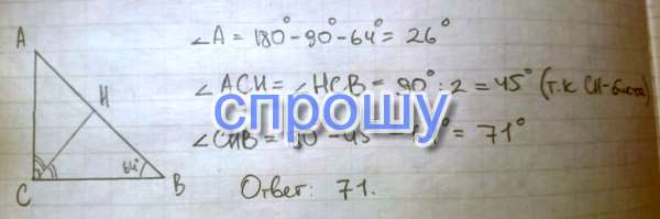 Один из углов прямоугольника треугольника равен 64 градусов. найдите градусную величину острого угла между биссектрисой прямого угла и гипотенузой