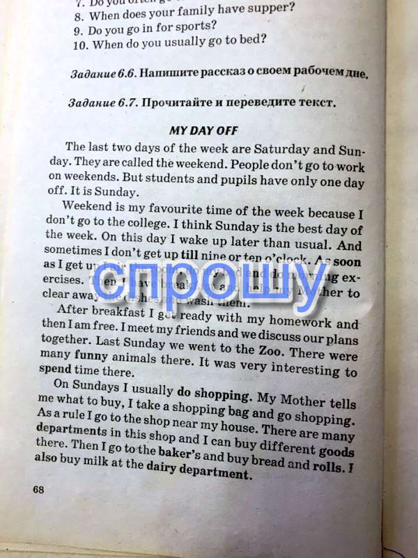 По воскресениям я обычно хожу на шоппинг.Моя мама говорит мне что купить и я иду в магазин. Как правило,магазин находится рядом с моим домом. В магазине много разных отделов и я могу многое там купить. Я иду в пекарню и покупаю там хлеб. Я всегда покупаю молоко в молочном отделе. Вечером мы с семьей собираемся вместе и смотрим телевизор или читаем книги. Чтение-мое хобби. Я люблю читать детективы или книги современных читателей. Где то в 11 вечера я ложусь спать.