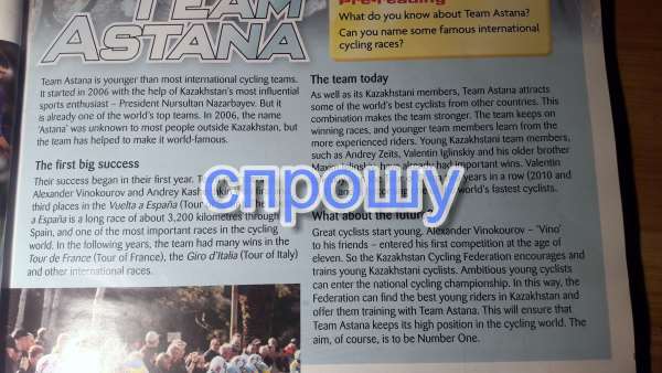 Что вы знаете о Команде Астаны Можете ли вы назвать несколько известных международных велогонок Команда Астаны моложе, чем большинство internatonalcycling команд. Команда сегодня началась в 2006 году с помощью Казахстан наиболее влиятельных в качестве своих членов казахстанской. Команда Астана привлекает энтузиастов спорта президент Nunsultan Назарбаев, а также лучшие велосипедисты мира из других стран. Это некоторые из уже является одной из лучших команд в мире. В названии Астана была неизвестна 2006 комбинация делает команду сильнее. Команда сохраняет для большинства людей за пределами Казахстана, но выигрывать гонки, и более молодых членов команды узнать из команды помогла сделать его всемирно известным. более опытные всадники. Молодые члены команды Karakhstani. таких, как Андрей Zeits, Валентин Iginskiy и его старший брат Первый большой успех Максим lglinskiy, уже имели важные победы. Валентин Их успех начался в первый год жизни. Члены команды lglinskiy выиграл Тур Китая два года подряд (2010 и Aleander Винокуров и Андрей Кашечкин выиграл первый и 2011) и становится одним из самых быстрых в мире велосипедистов третье места в Welta Espana (наш Испании). Welta Espana является длинная гонка около 3.200 километров через Что можно сказать о будущем Испании, и один из самых важных гонок в велоспорте Большие велосипедисты начинают молодой, Неандер Винокуров Vino мир. В последующие годы, команда имела много побед в Ио его друзья вошли в его первый конкурс в возрасте Тур де Франс Тур Франция), Giro dТалию (Тур Италия) одиннадцать. Таким образом, Федерация велосипедного Казахстан поощряет и и другие международные гонки. обучает молодых казахстанских велосипедисты. Амбициозные молодые cyclsts может войти в чемпионат по велоспорту. Таким образом, Федерация может найти лучших молодых nders в Казахстане и предлагают их обучение с командой Астана. Это гарантирует, что команда Астана сохраняет свое высокое положение в мире велоспорта. Цель, конечно, должен быть номер один.