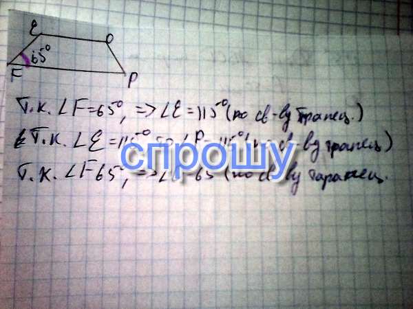 Найдите углы трапеции FEOP, если угол F равен 65 градусов