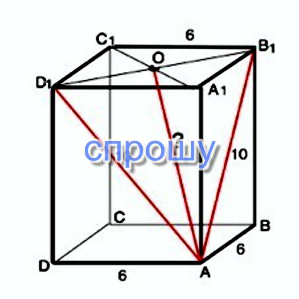 треугольник В1АD1 равнобедренный, т.к. диагонали равных граней равны. Диагонали квадрата равны и точкой пересечения делятся пополам. OB1=OD1=3√2