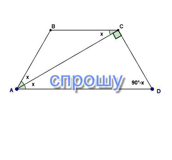 ∠BAD=∠ADC=90°-∠CAD=90°-x (т.к.∠ACD=90° и трапеция равнобедренная).