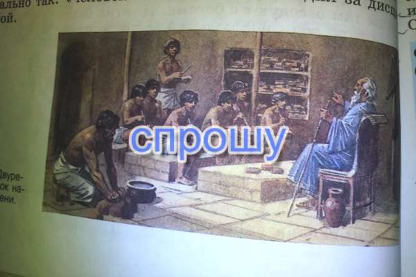Опишите пожалуйста, что делает работник сидящий рядом с учениками, лепящий глину. Что он делает? (Понятно, что лепит из глины, опишите).