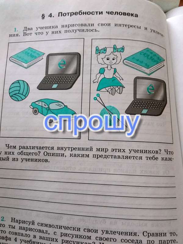 Внутренний мирд детей отличается увлечениями: на 1 картинке скорее всего увлеч. мальчика мяч машина интернет ;на 2 увлеч. девочки кукла ,клубок и тд.Общее у детей увлечения это интернет и книги.