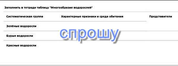 Заполнить в тетради таблицу "Многообразие водорослей"