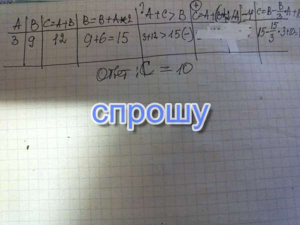 Вычислите, чему равняется значение переменной С, после выполнения следующего алгоритма: А = 3 В = 9 С = А + В В = В + А * 2 если А + C > B то С = А + В * 2 / А - 4 иначе С = В - В / 3 * А + 10