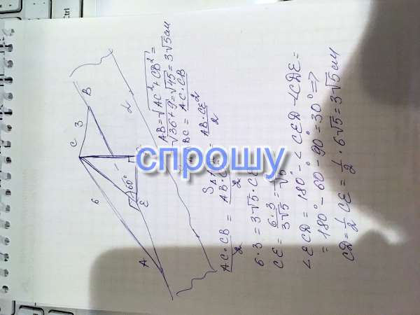Через гипотенузу АВ прямоугольного треугольника АВС проведена плоскость , образующая с плоскостью треугольника двугранный угол, величина которого равна 60 градусов. Найдите расстояние от вершины С треугольника до плоскости , если катеты данного треугольника имеют длину 3 и 6 дм