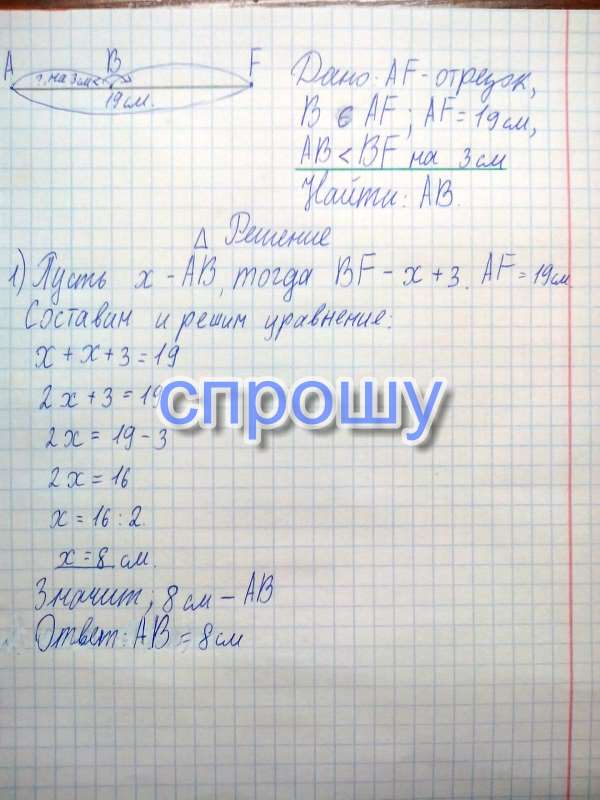 Точка B лежит на прямой AF между точками A и F. известно что отрезок AB на 3см меньше отрезка BF. Определите длину отрезка AB если AF = 19см