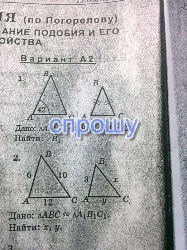 2. Так как известно что треугольники подобны мы можем вычислить коэффициент подобия 6/3=2. Первый треугольник в два раза больше второго, значит у=6; х=5