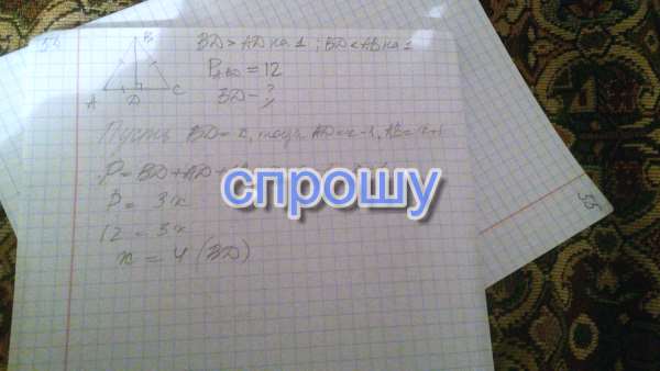 Треугольник АВС равнобедренный ,ВD -высота треугольника.Длина ВD на 1см больше длины АD и на 1см меньше длины отрезка АВ.Периметр треугольника АВD равен 12см.Найдите длину отрезка ВD.