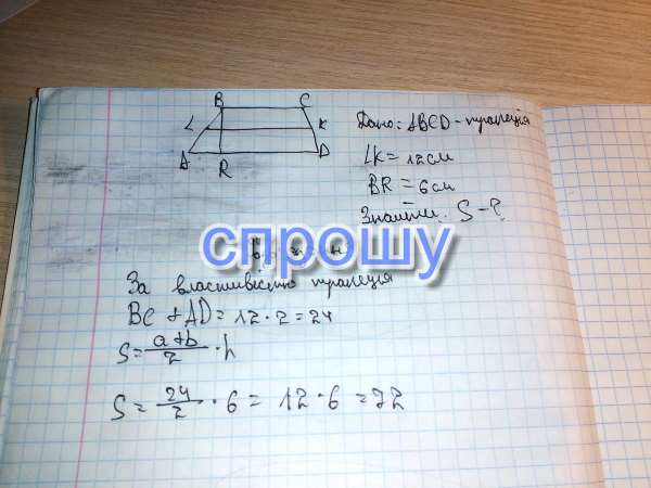 Найдите площадь трапеции, средняя линия которой равна 12 см, а высота 6 см.