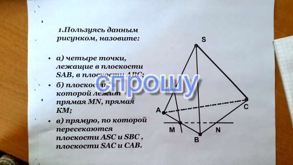1) A, B, K, M. M, N, B, C. 2. MN в плоскости ABC, KM в плоскости ABS. 3. SC; AB