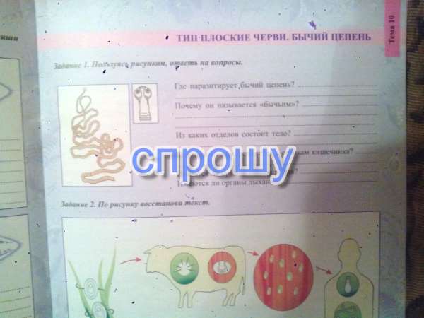 Обычно паразитирует в кишечнике.Называют бычьим ,потому что обитает в основном в кишечники крупного рогатого скота(коровы,быки).Тело состоит из многочисленных проглоттид. Прикрепляется к стенкам кишечника с помощью сколекса,который состоит из 4 присосок без крючков.Не имеет органов пищеварения и дыхания ,по скольку обитает в бескислородной(анаэробной)среде,то есть в кишечнике,и поглощает готовую расщепленную пищу хозяина.По скриптум (не именее пищеварительной системы означает и отсутствие выделительной системы)