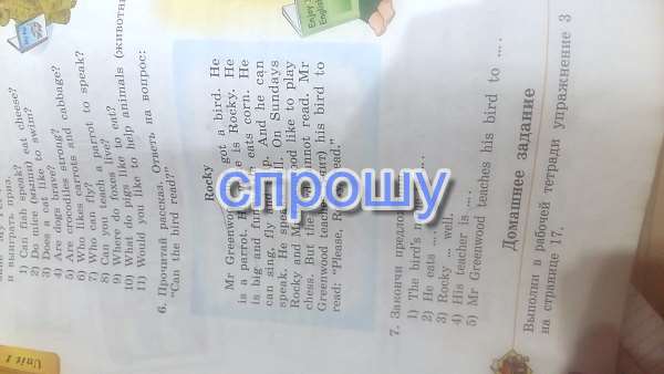 У мистера гринвуда есть птица. это попугай.его зовут рокки.он большой и смешной и он ест кукурузу.он может петь, летать и др.и он может говорить.он хорошо говорит.по воскресеньям мистер гринвур и рокеи любят играть в шахматы.но птица не умеет читать.мистер гринвуд учит птицу читать читай рокеи читай