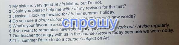 1 at 2 with 3 for 4 dictionary 5 subject 6 revise 7 lesson 8 course