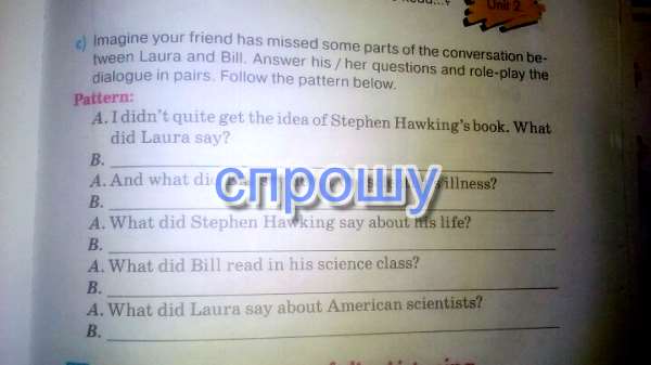 1. Laura said that Stephen Hawking had written a book for non-scientists to explain the basic forces of nature. 2. Bill said that Stephen Hawking had fallen ill when he was a student, he cant move any parts of his body. 3. He said that despite his disability he is lucky in almost every other respect. 4. В тексте нет про урок науки, есть только про научный журнал, напишу это. Bill read that Americans invented radio, television, computers, telephones, VCRs, airplanes and many more. 5. Laura said that in America they respect creativity, so the scientists are always looking for faster, cheaper, easier or better ways of doing things which usually means inventing new devices.