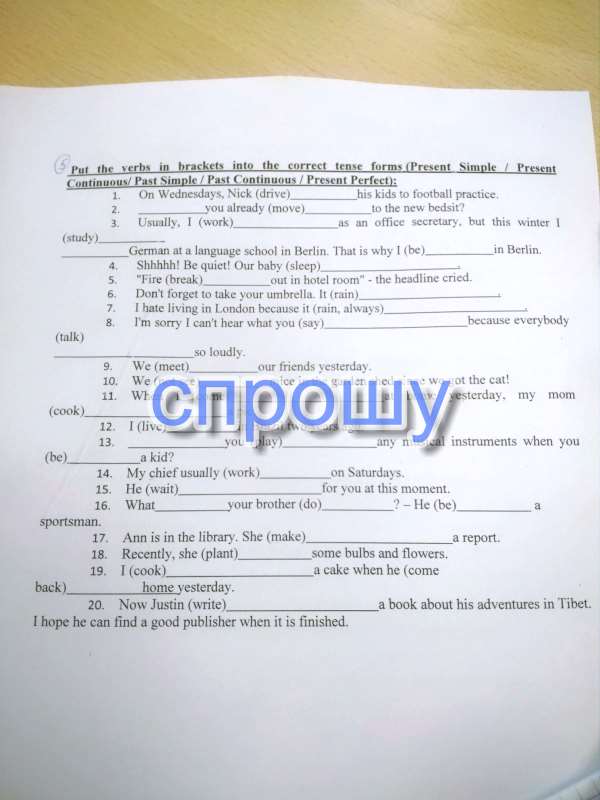1. Drives 2. Have you already moved 3. Work, am studying, am 4. Is sleeping 5. Broke 6. It is raining 7. It is always raining 8. Are saying, is talking 9. Met 10. Havent seen 11. Came(и at не нужно после came), was cooking 12. Lived 13. Did you play, were 14. Works 15. Is waiting 16. What does your brother do, is 17. Is making 18. Можно planted и has planted, но я бы лично второе выбрала 19. Was cooking(и вообще не cooking, a baking), came back 20. Is writing