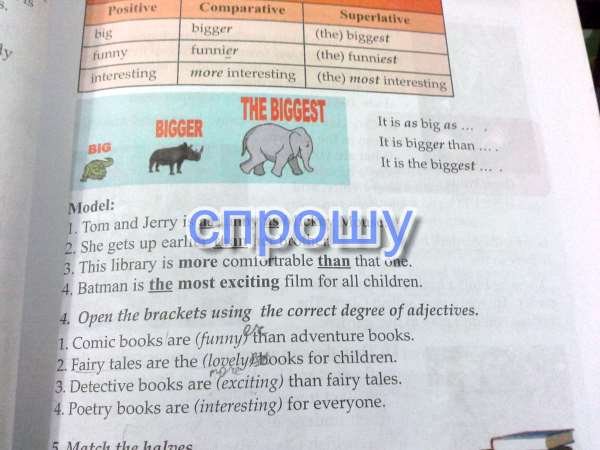 Буду писать только слово, которое нужно изменить, остальное предложение так же. 1. Funnier 2. Loveliest 3. More exciting 4. The most interesting
