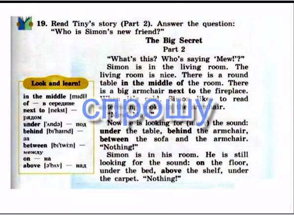 Что это Кто говорит "Мяу " Саймон (находится ) в гостиной. Она приятная. В середине комнаты есть (расположен) круглый стол. Рядом с камином находится большое кресло. Когда бывает холодно, Саймон любит читать интересные книги , сидя в кресле у камина. "Мяу !Мяу !"