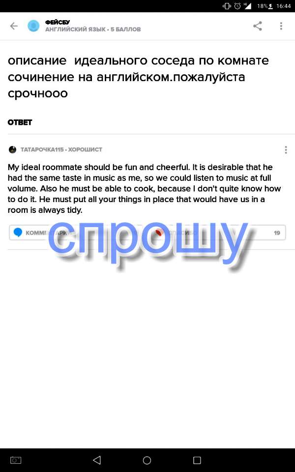Мой идеальный сосед по комнате должен быть весёлым. Желательно, чтобы он имел такой же вкус, как и у меня, чтобы мы могли слушать вместе музыку на полную громкость. Так же он должен уметь готовить, так как я умею. Он должен всегда ложить все свои вещи на место, чтобы в комнате была чистота.