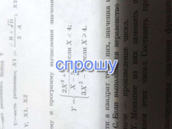 Var y, x: real;beginread(x);if x lt; 4 then y:= 2*sqr(x)*x + 1/ x - 5;if xgt;= 4 then y:= 3*sqr(x) - 2;writeln(y);end.
