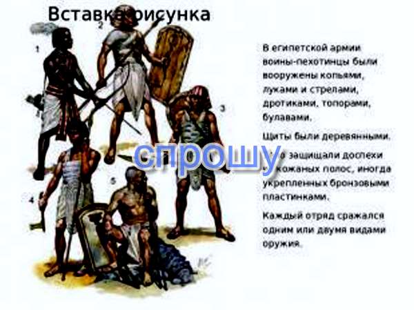Поскольку в Египте очень жарко какой-то особой «военной формы» или защитной одежды древние воины не имели. Вся их одежда состояла из традиционной юбки, парика из овечьей шерсти, игравшего роль шлема, защищающего голову от оглушающего удара булавы и щита. Последний делался из бычьей шкуры шерстью наружу, которая, видимо, соединялась в несколько слоев и натягивалась на деревянную раму. Щиты были большими, закрывавшими человека до самой шеи и заостренными сверху, а также несколько меньшего размера, сверху закругленные, которые воины удерживали за ремни, крепившиеся с обратной стороны.