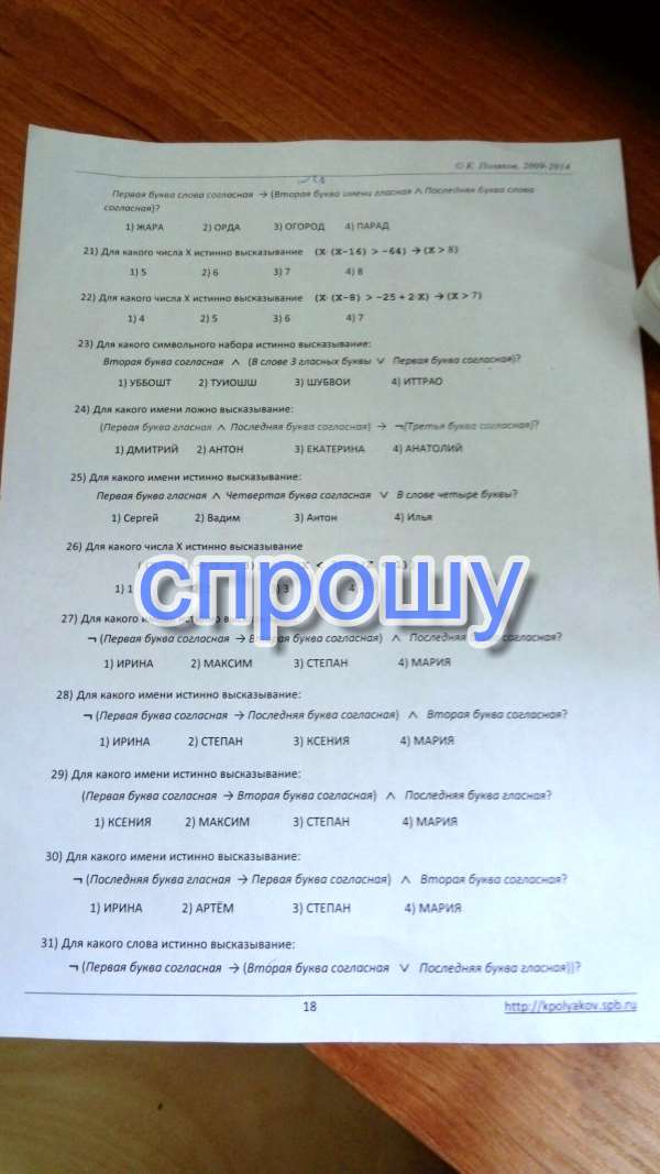 №22. Высказывание хgt;7 ложно для всех предложенных вариантов ответов. Значит ложной должна быть и посылка в импликации, а это выполняется только для х=7 Ответ: 4)7